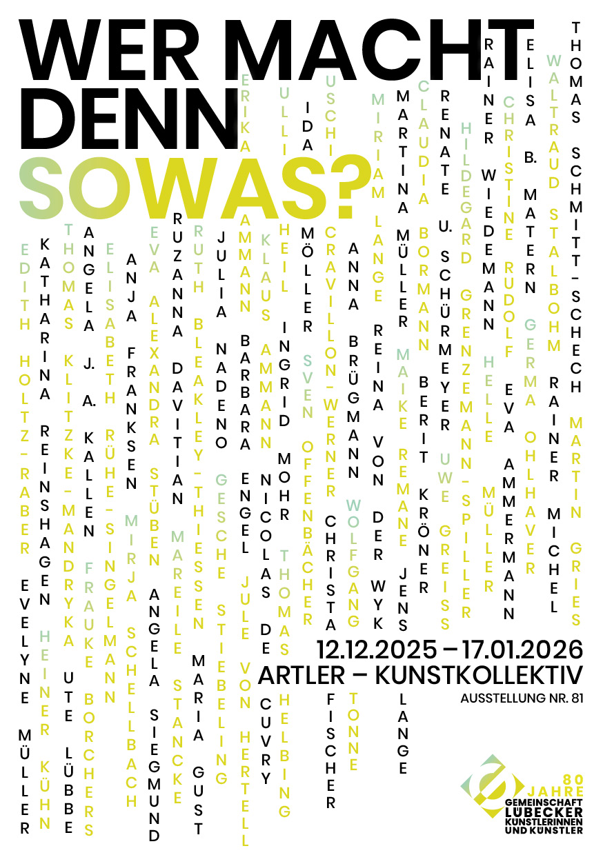 Vernissage 30. August 2025, 17Uhr Öffnungszeiten: DO & FR 16 -19 Uhr, SA 14 – 18 Uhr Artler – Kunst Kollektiv, Große Burgstraße 32, 23552 Lübeck